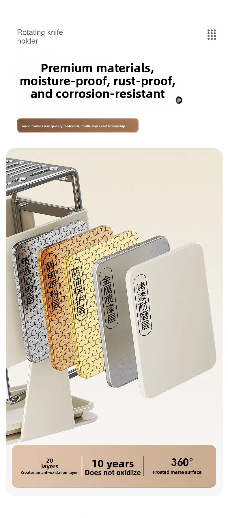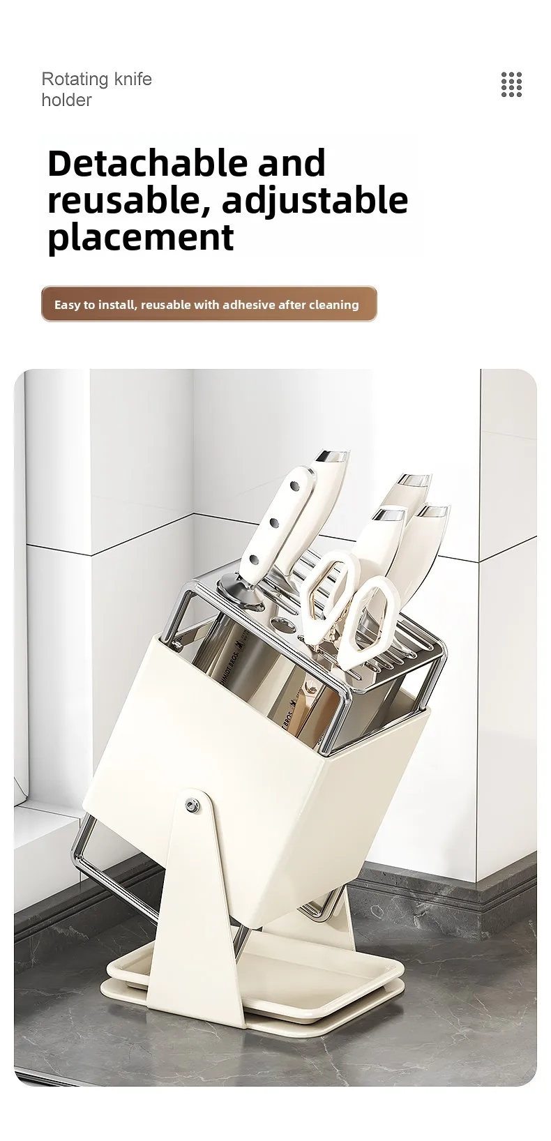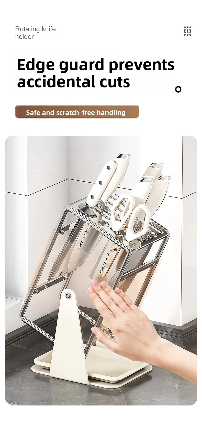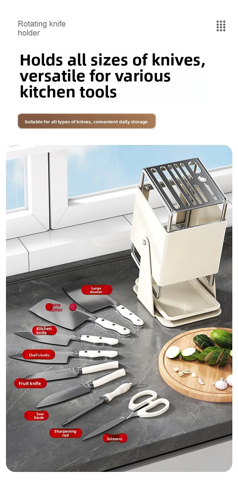 This multifunctional knife holder not only stores your knives but also doubles as a rotating stand for easy access.