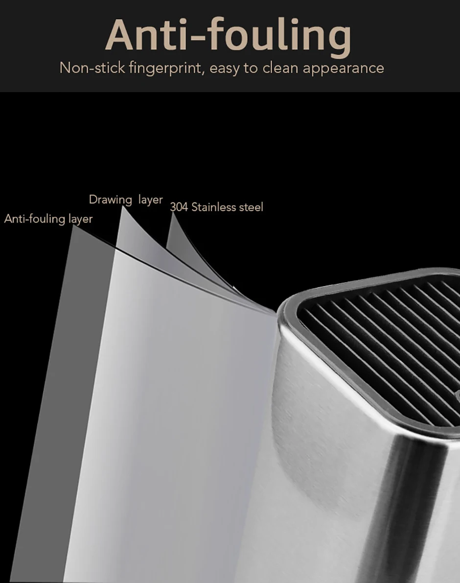 PREMIUM QUALITY MATERIALS: Knife block universal is made from superior quality, extra-durable stainless steel. The metallic finish wonrsquot rust or oxidize over the years!KNIFE PROTECTOR: Knife block storage is extremely easy to clean, being dishwasher safe, and wonrsquot allow to damage your knives.PRACTICAL DESIGN: Stainless steel knife block has antibacterial properties . This knife organizer can fit blades of up to 8 inches long.ORIGINAL GIFT IDEA: Order this amazing kitchen knife block as a birthday, Christmas or housewarming gift, and you can be sure they will really appreciate it